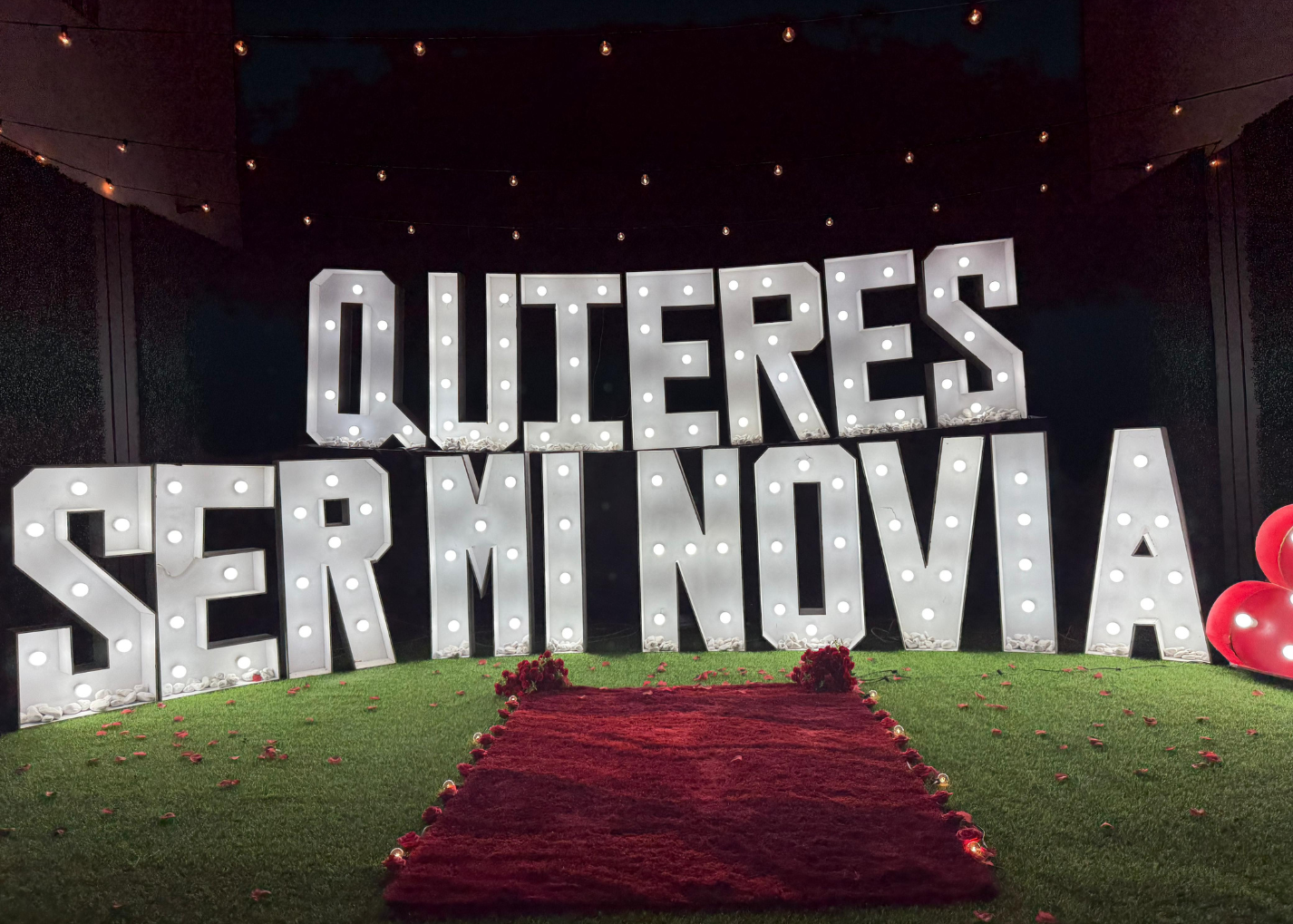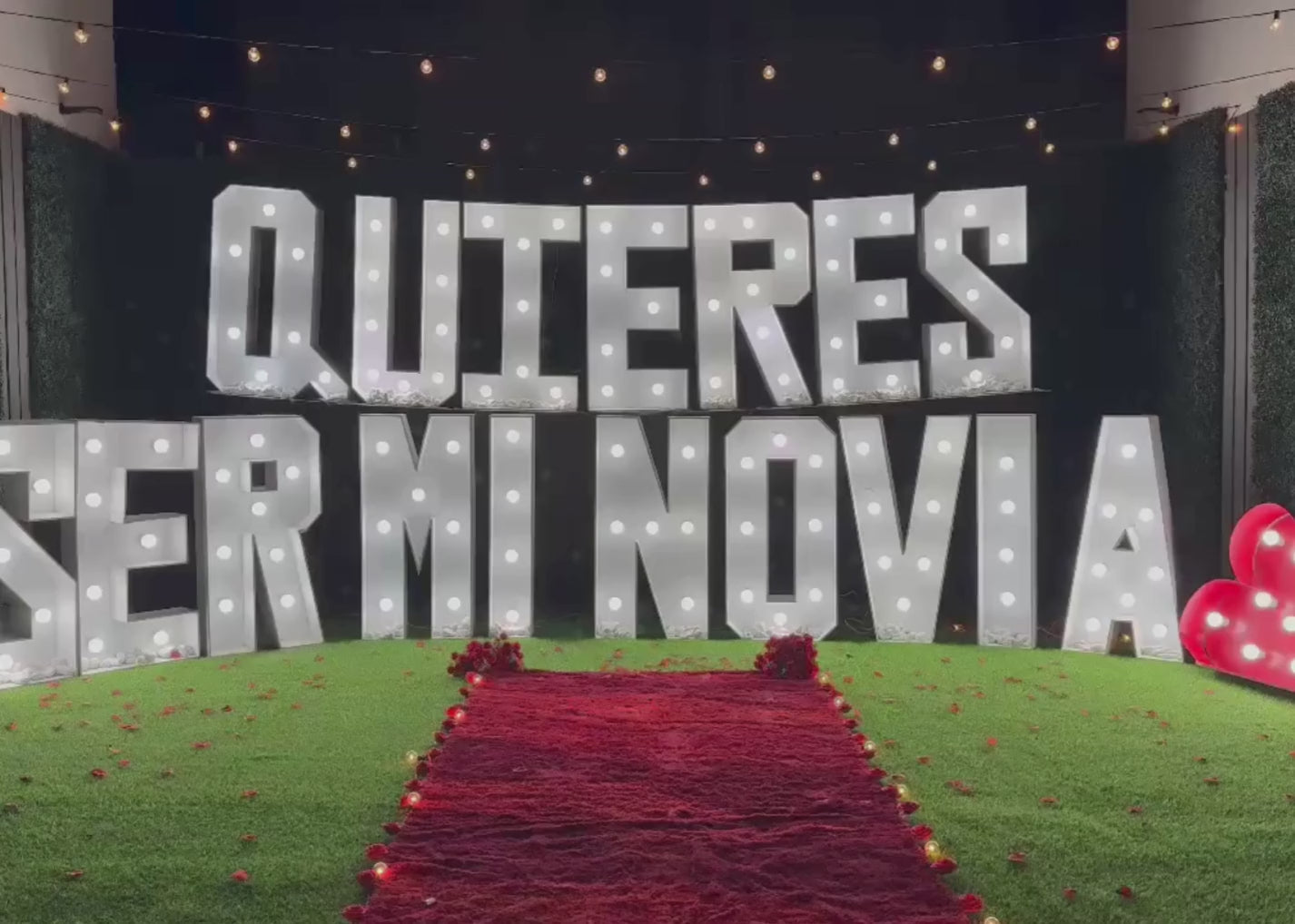Esta experiencia está diseñada para el impacto visual y la emoción pura: un jardín privado transformado con letras gigantes iluminadas y un corazón gigante, todo culminando con espectaculares chisperos.
