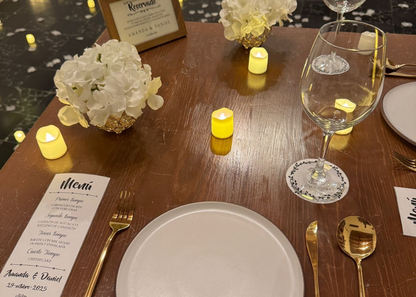 - Decoración romántica: Cristalería, toques florales y velas LED.