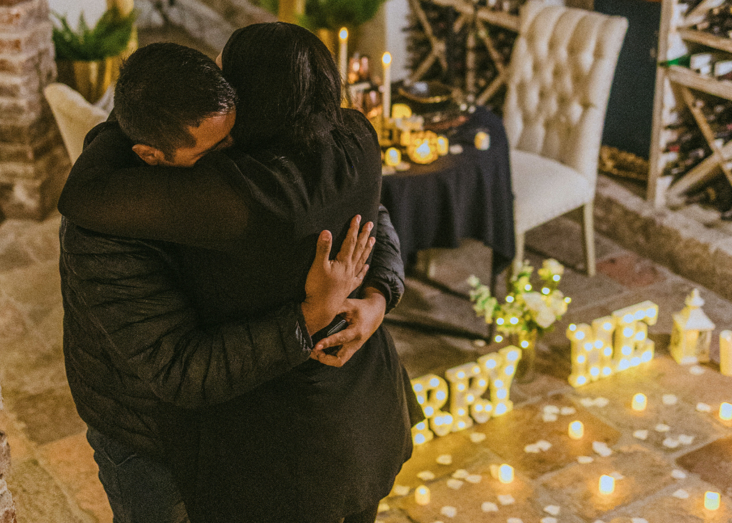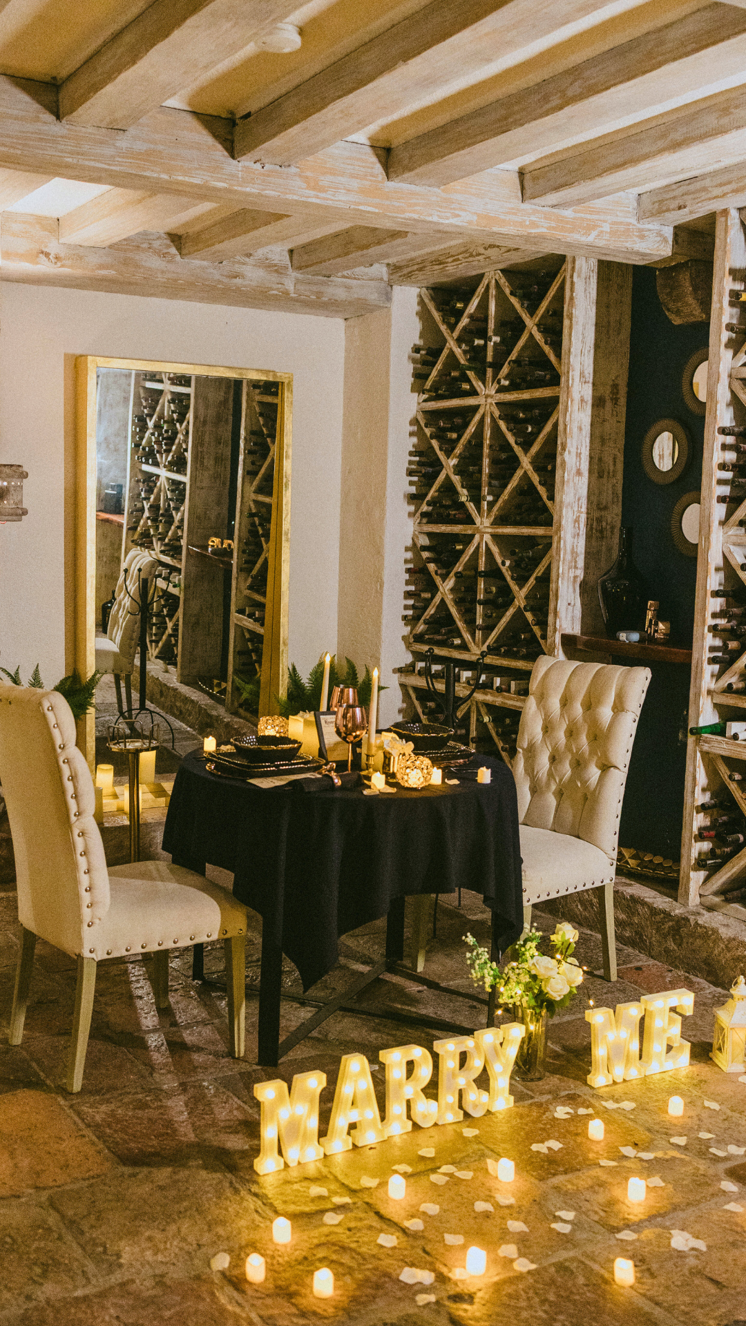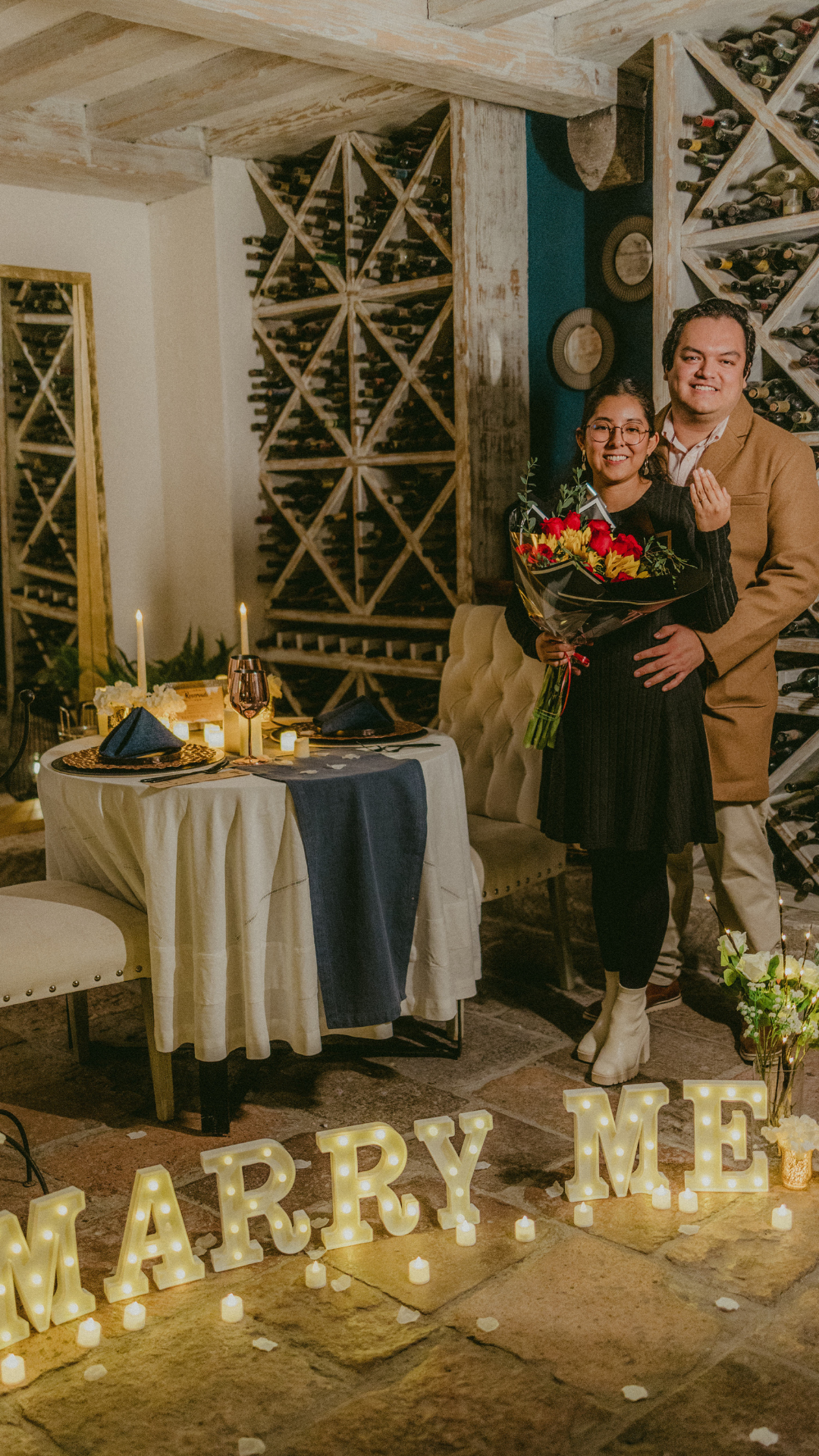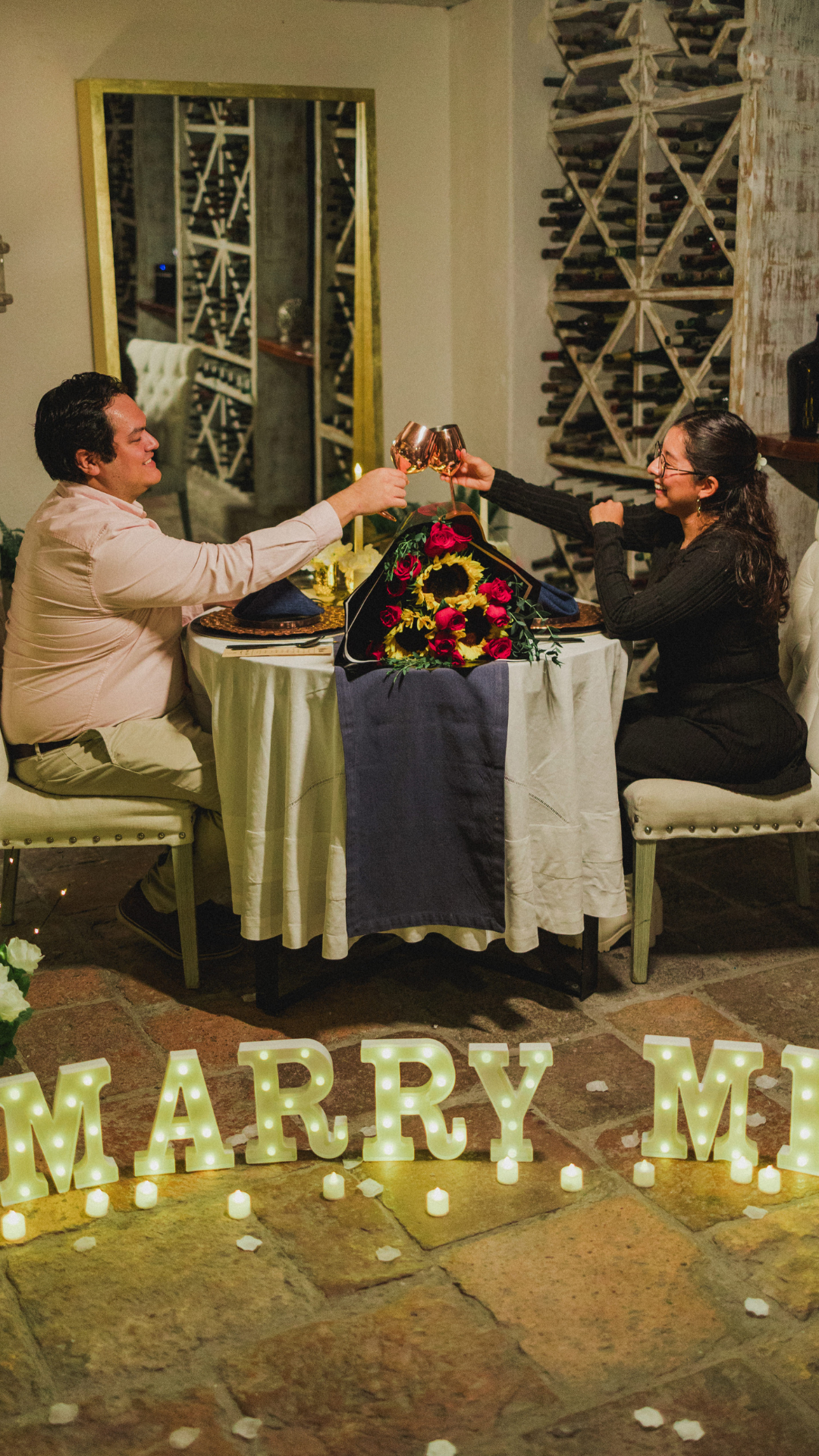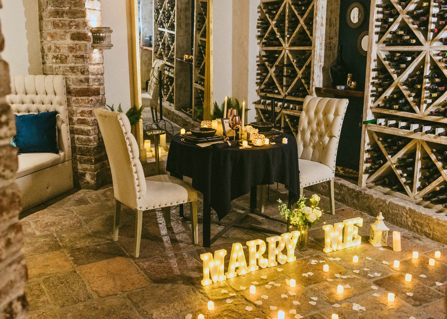 "Añade letras gigantes "MARRY ME" LED y un ramo de flores para hacerla más romántica aún."