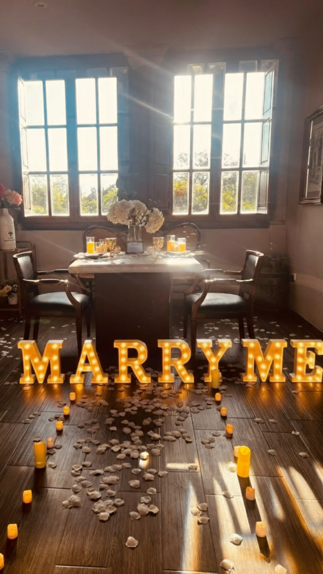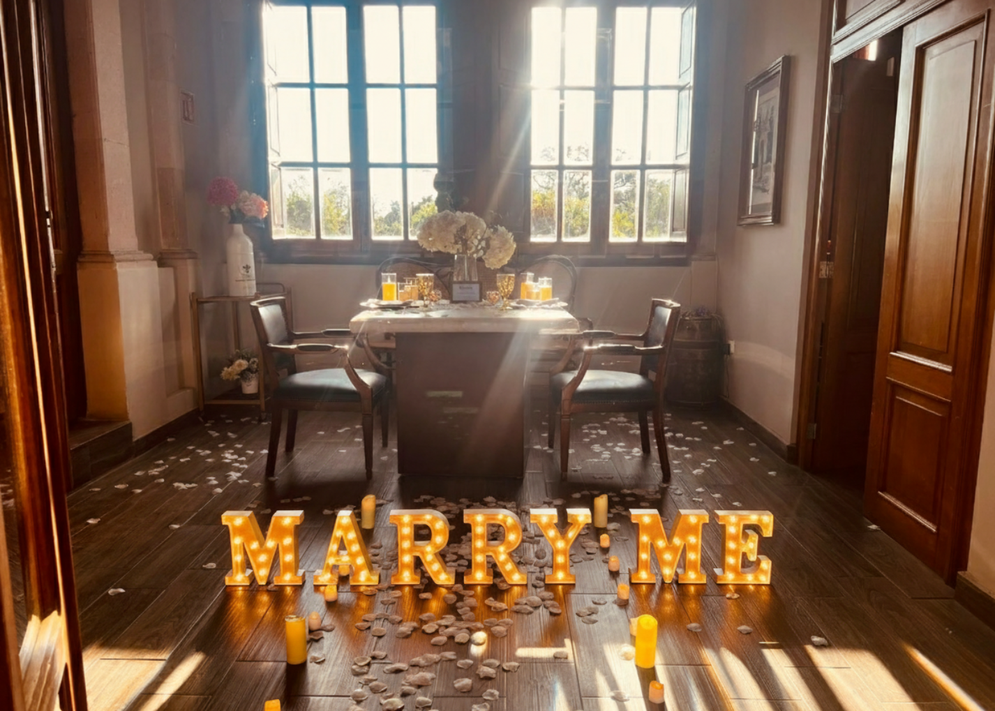- Letras luminosas de 30 cm a elegir: MARRY ME // TE AMO.