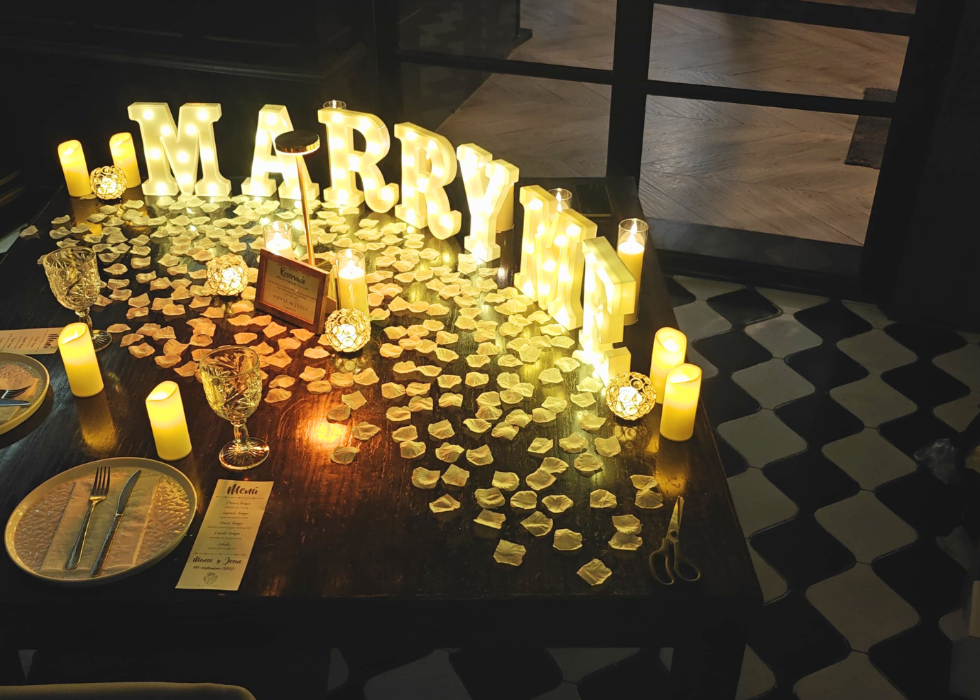 - Letras luminosas de 30 cm a elegir: MARRY ME // TE AMO.