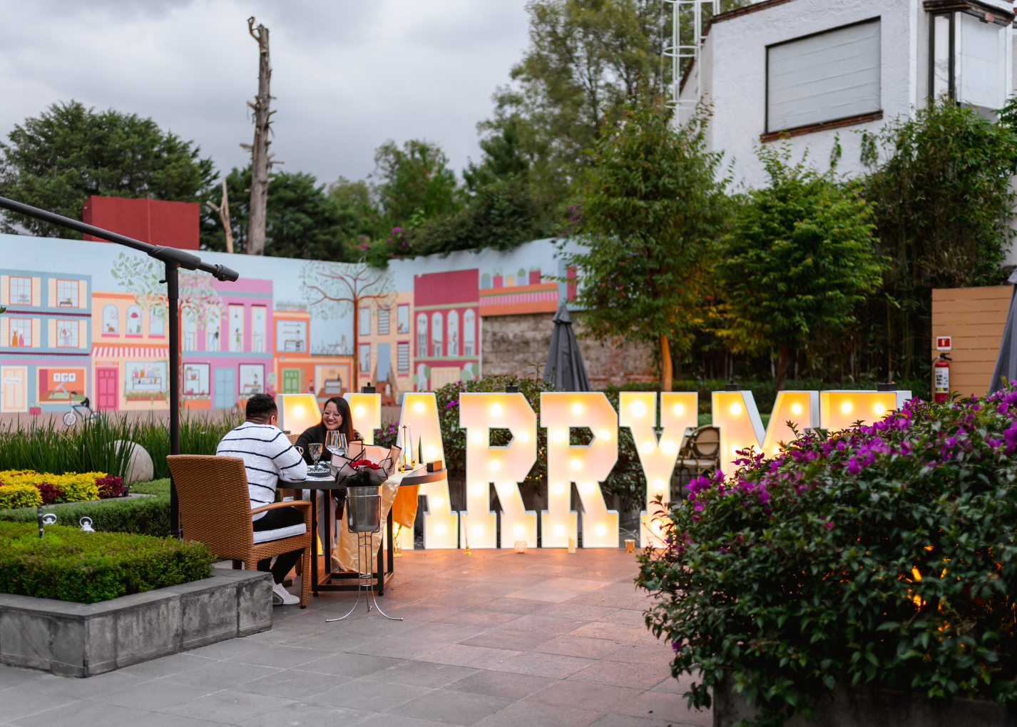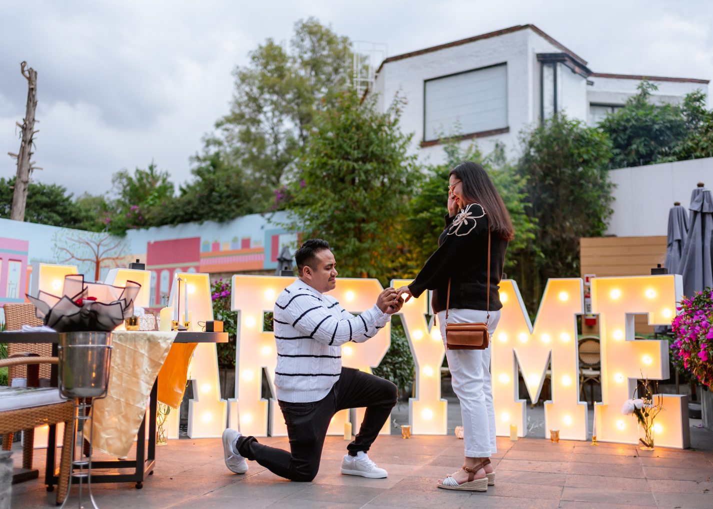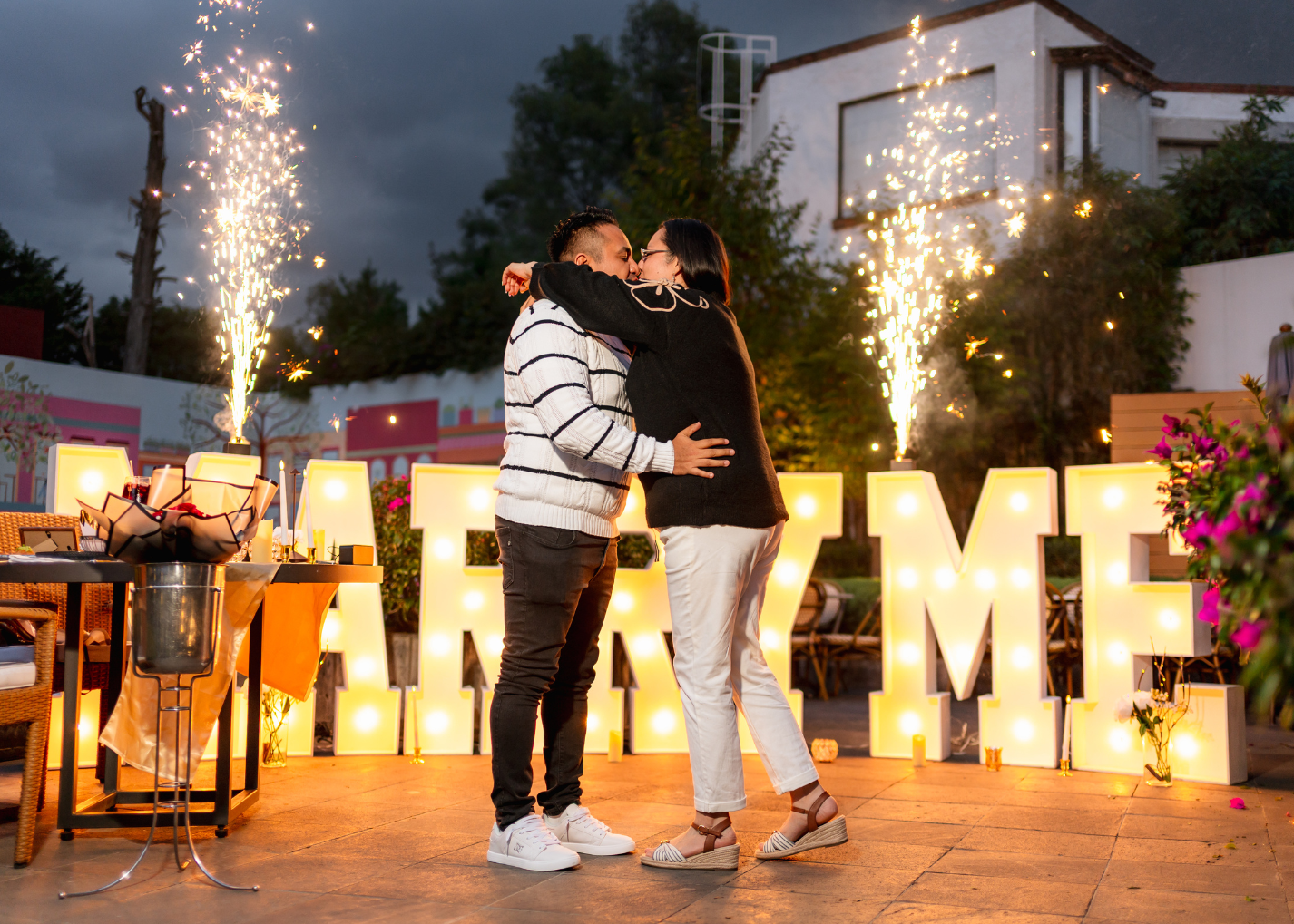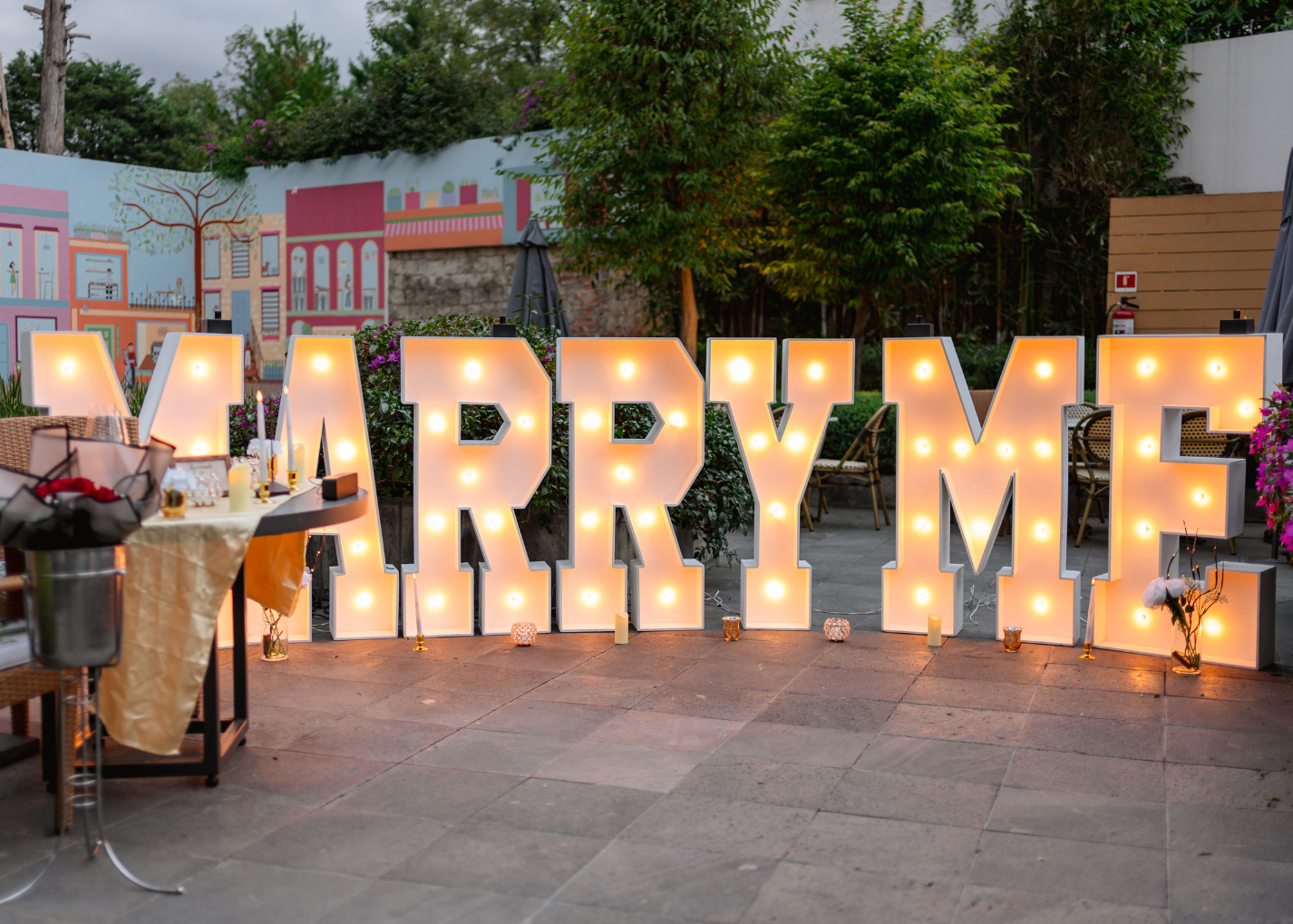 - Letras luminosas a elegir: MARRY ME, CÁSATE CONMIGO, TE AMO, QUIERES SER MI NOVIA (O) y PUEDO SER TU NOVIO (A) de 30 cm.